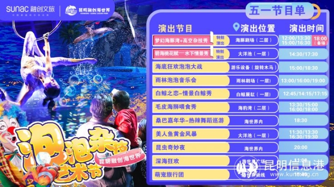 在“五一”小长假来临之际,记者从昆明融创海世界了解到,“五一”期间,融创海世界将打造首届“海洋泡泡杂技艺术节”,并与“碧海桃花赋”表演秀、“高空绸调”杂技秀、“海洋奥秘”展览等多个节目组成“五一”假期特别活动。