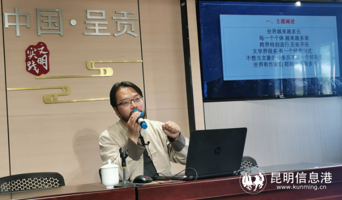 讲完后,温星马不停蹄赶往呈贡,主讲呈贡文旅局主办的“书香呈贡 名家有约”,主题《多面与多元:优秀作品的阅读与传播》。他讲述自己与刘文典、陈寅恪、熊庆来等大师后人的缘分和交往,分享《刘文典批校<庄子集释>影印本》、晓雪《我的文学人生》、《张宗和日记》及徐剑《经幡》等作家作品不为人知的价值与细节,一口气两小时,中间无休。
