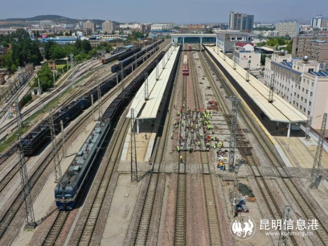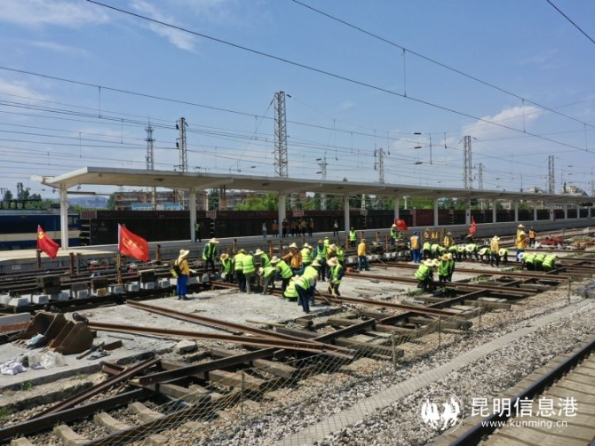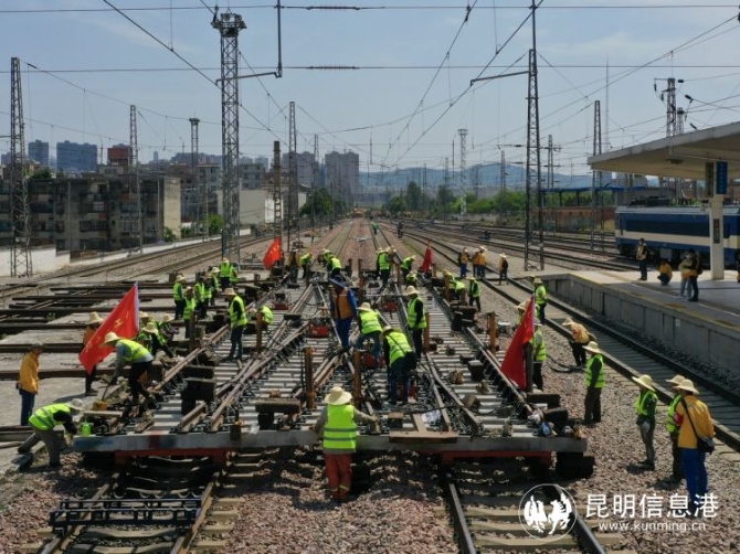 昆明信息港讯 记者上官艳君 4月27日下午14时,云南曲靖火车站正线昆明方向信号灯全部转红,212名作业人员、5台挖机和两列施工车组迅速进入指定位置,曲靖站大修道岔更换施工全面展开。
