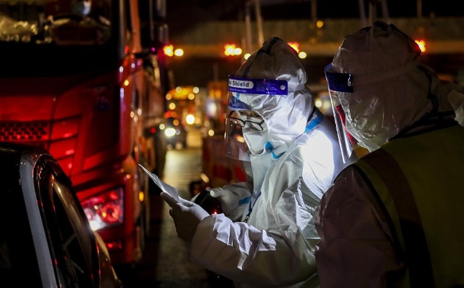 △4月23日,江苏淮安市,疫情防控志愿者在长深高速淮安南出入口,对过往车辆和人员行程信息、健康信息进行查验。