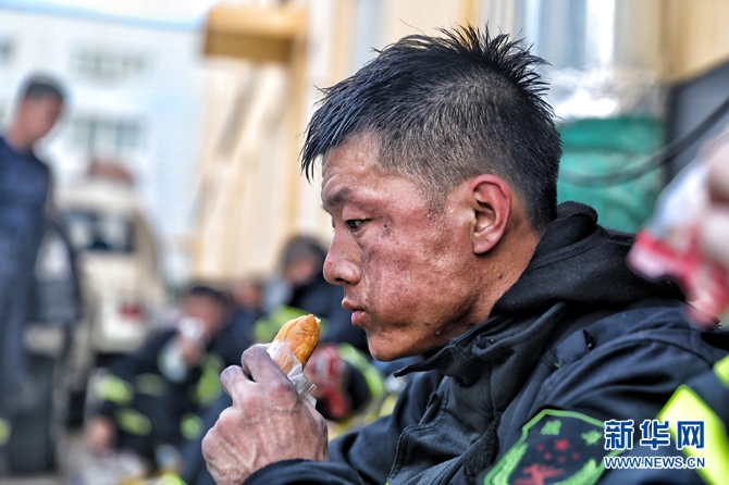 扑灭大火后,刘亮面部及耳朵被烤红。 新华网发