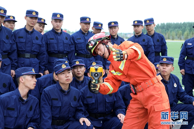 刘亮为新入职的消防员讲解器材装备。 新华网发