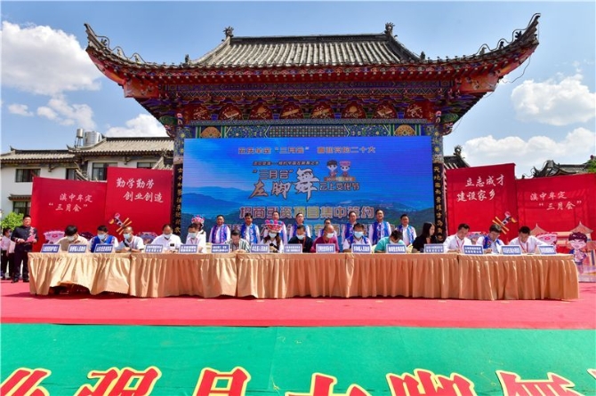 4月29日下午,2022中国·牟定“三月会”左脚舞云上文化节招商引资签约仪式中,来自省内外的26家企业或投资商就牟定26个项目与牟定县达成长效合作,携手并进的共识,集中签约总投资额达211.04亿元。