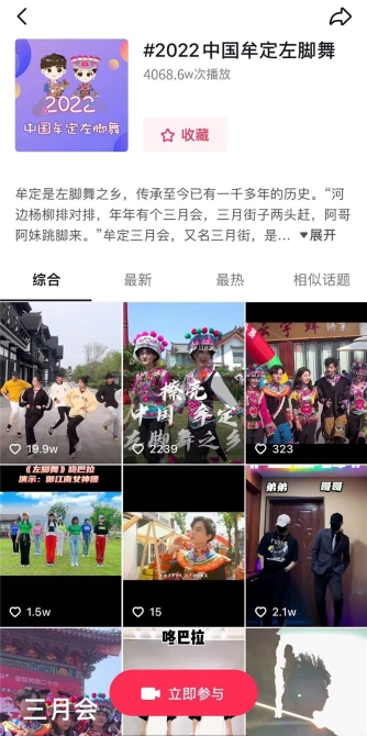 除了主流媒体和网红达人宣传,在短视频话题推广方面,2022年4月10日,话题#2022中国牟定左脚舞#在抖音、快手平台上线,截至5月2日14:00共发布短视频超1700条,话题累计播放量达6320万次。其中,抖音平台话题播放量超4068万,快手平台话题播放量超2257万。鸟木、小明、刘熙墨、云南塔哥、Aglie-高鹏、跟着嘉宁去旅行等流量网红视频热度将持续增长中。