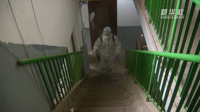志愿者团队背着沉重的消杀设备,每天穿梭于康健街道各小区内,日均上下一千多级楼梯。