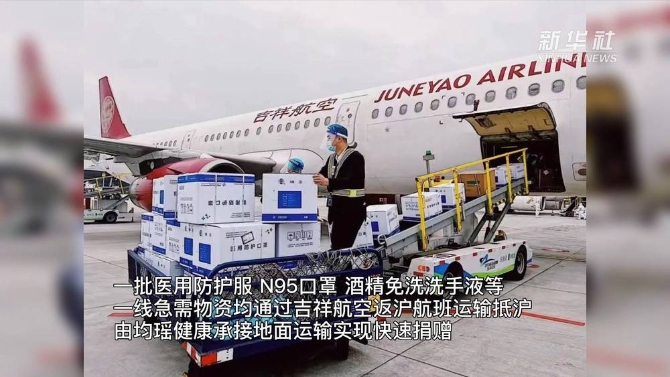 此外,为了更好地守护社区抗疫的“大白”“大蓝”们,一批医用防护服、N95口罩、酒精免洗洗手液等一线急需物资均通过吉祥航空返沪航班运输抵沪,由均瑶健康承接地面运输实现快速捐赠。
