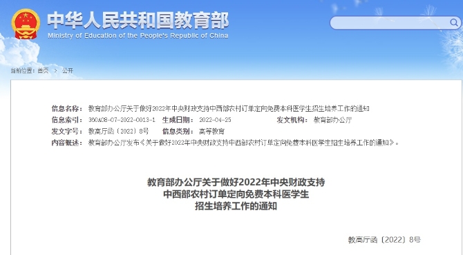 为贯彻落实《国务院办公厅关于改革完善全科医生培养与使用激励机制的意见》(国办发〔2018〕3号)精神,继续实施农村订单定向医学生免费培养,现将2022年中央财政支持的中西部地区农村订单定向免费本科医学生招生培养工作的有关事宜通知如下。