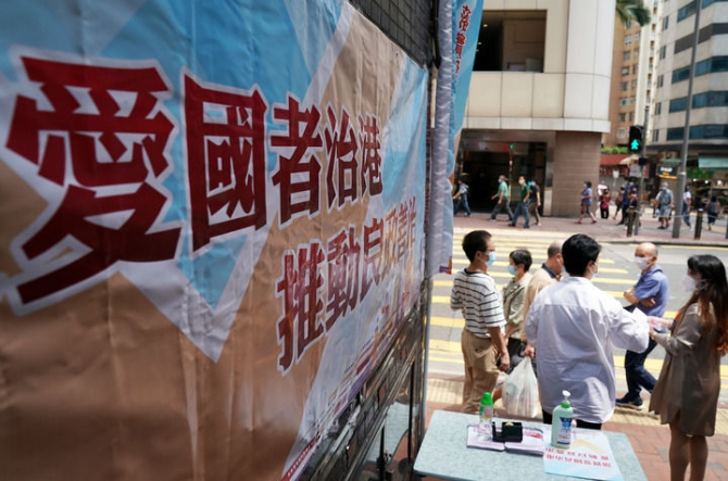 香港街头举办“落实爱国者治港 推动良政善治”街站宣传活动(2021年9月12日摄)。新华社记者 李钢 摄