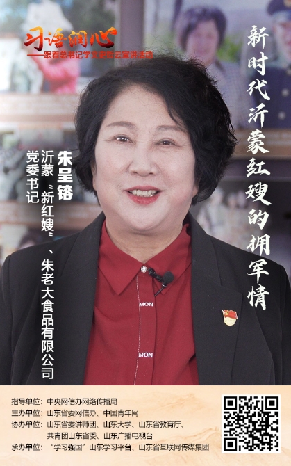 为喜迎党的二十大胜利召开,推动党史学习教育常态化长效化,激发广大网民特别是青年群体深刻理解“两个确立”的决定性意义,增强“两个维护”的自觉性、坚定性,5月9日,在习近平总书记给《文史哲》编辑部全体编辑人员回信一周年之际,“习语润心——跟着总书记学文史哲”云宣讲活动正式启动。活动由中央网信办网络传播局指导,山东省委网信办、中国青年网主办,山东省委讲师团、山东大学、山东省教育厅、共青团山东省委、山东广播电视台协办,“学习强国”山东学习平台、山东省互联网传媒集团承办。今天,让我们将目光聚焦到沂蒙大地,听沂蒙“新红嫂”、朱老大食品有限公司党委书记朱呈镕讲述沂蒙精神在新时代的传承故事。