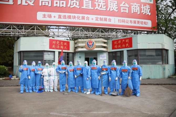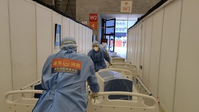 4月19日,根据上级指示,新国博方舱医院W1与W2舱需改造为方舱内定点医院。为加快落实“四应四尽”的步伐,尽快收治患者,陈尉华再次想到了坚实的战友——消防队的“蓝精灵”。大队长李和清立即派出11名消防队员在院感的指导下,对两个场馆近3万平方米进行消杀。24小时后,顺利完成病区改造。4月21日中午,队员们还没吃饭,又赶往病区进行床位布置。