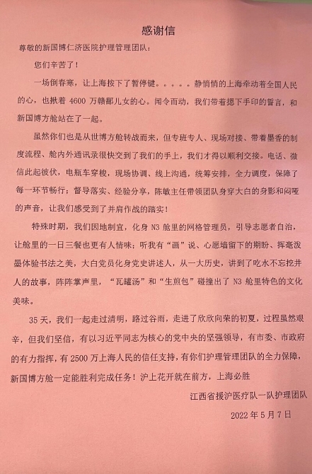 5月7日,收到上级指示,江西医疗队完成新国博方舱医院支援任务,将继续前往支援定点医院。江西医疗队领队罗礼生与管理团队向仁济医院管理组告别,江西医疗队护理部主任曹英向仁济医院护理团队以及江西医疗队护理联络人张占国表示由衷感谢。