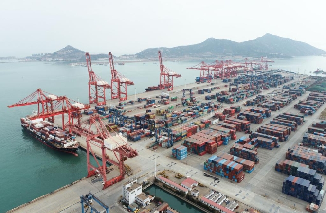 3月7日拍摄的江苏连云港港口集装箱码头场景(无人机照片)。新华社发(王健民摄)