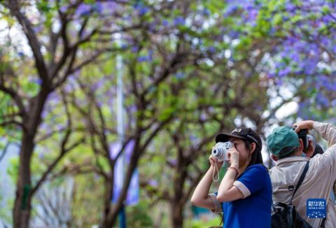近日,昆明教场中路的蓝花楹进入盛花期,吸引不少市民游客到此“打卡”。近年来,昆明以花为媒,将美景与文旅、文创、文化等结合,为春城花都增添魅力和活力。
