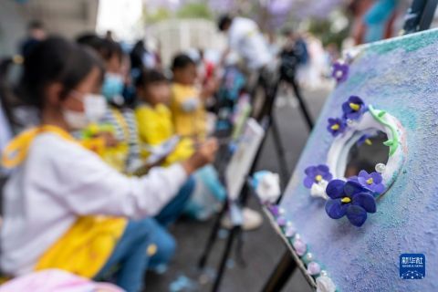 这是5月8日拍摄的由小朋友创作的蓝花楹主题艺术作品。