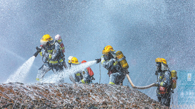 消防员在演练中清理“火场”。柳永泉摄(人民视觉)