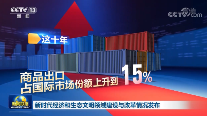 全方位、高水平对外开放新格局形成。商品出口占国际市场份额由11%上升到15%,货物贸易第一大国地位得到增强,部署建设21个自贸试验区和海南自由贸易港。