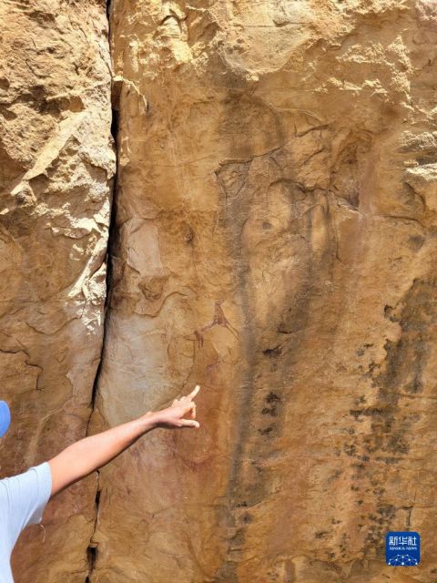 5月3日,在博茨瓦纳图利自然保护区内的莫哈巴能岩画遗址,向导曼亚查向记者介绍岩画。
