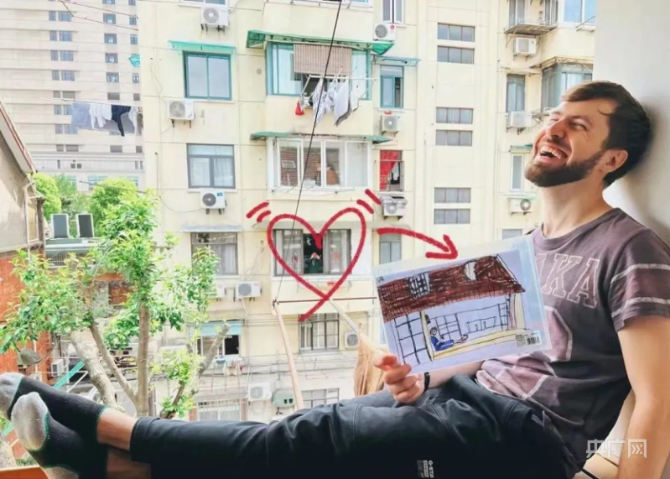 前不久刚好是Matveev的30岁生日,他和女友在阳台上共同庆祝生日,刚好被对面的邻居看到,邻居们不但“隔空”唱起了生日歌,还准备了两幅画送给他,“这是对面3楼的小朋友画的,这幅是5楼的邻居送的,这两份礼物太特别了。”Matveev笑着回忆道。
