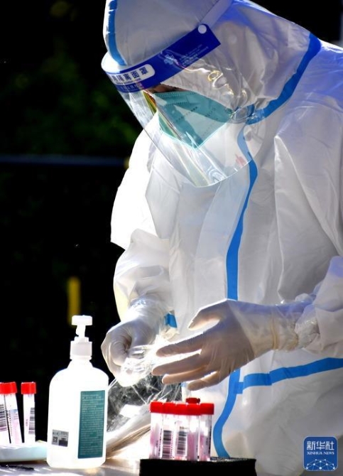 ↑5月13日,在朝阳区八里庄街道朝阳无限社区的检测点,一名医护人员准备为居民做核酸检测。新华社记者 李欣 摄