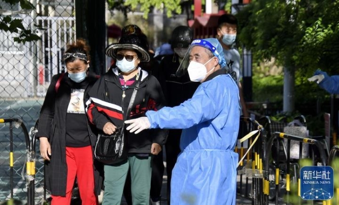 ↑5月13日,朝阳区八里庄街道朝阳无限社区的检测点志愿者在引导居民参加核酸检测。新华社记者 李欣 摄