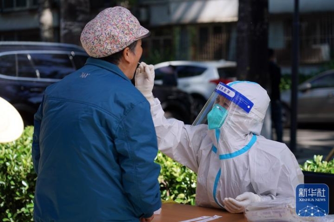 ↑5月13日,一名医护人员在朝阳区八里庄街道朝阳无限社区的检测点为居民做核酸检测。新华社记者 李欣 摄