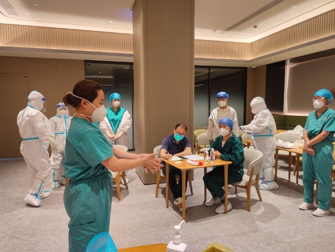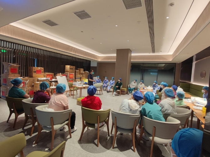 山西援沪医疗队的队员们正在培训院感防控。(受访者提供)