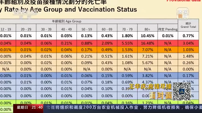 王华庆:我们一直在倡导大家去了解认识风险和获益,假如说我们一直感受不到疾病威胁的话,大家可能考虑的主要是这个问题。但是如果说感染这个病毒带来的风险80岁以上病死率超过16%和我们不良反应百万分之一相比的话,其实可以看到非常巨大的一个差距。