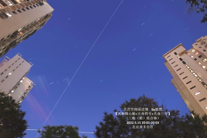 5月16日,中国空间站过境南京,天舟四号与核心舱、天舟三号组成“一”字构型。(徐成城、朱一静 提供)