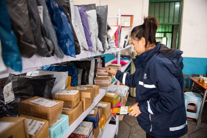 湖南省衡阳市耒阳市黄市镇新生快递乡村服务站的站长胡夏在整理快递(2021年11月3日摄)。新华社记者 陈思汗 摄