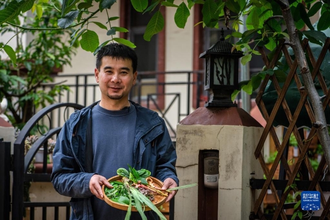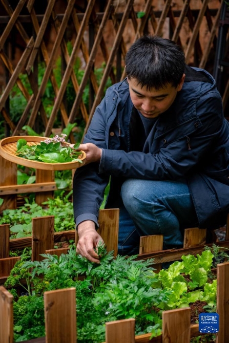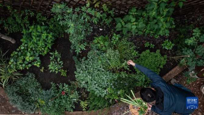 上官法智在自家花园展示采摘的可食用植物。新华社记者 胡超 摄
