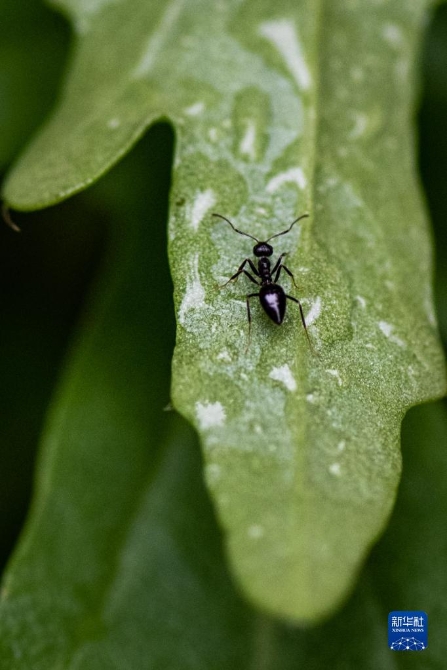 一只蚂蚁在芝麻菜上。新华社记者 胡超 摄