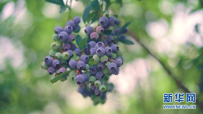 新鲜蓝莓一串串的挂在绿叶底下,晶莹透亮,让人垂涎欲滴。新华网发