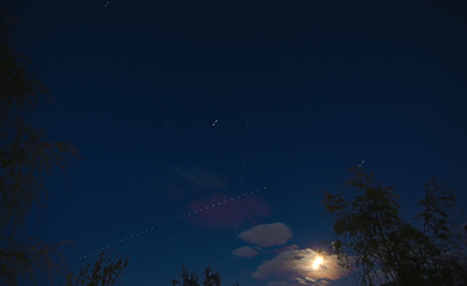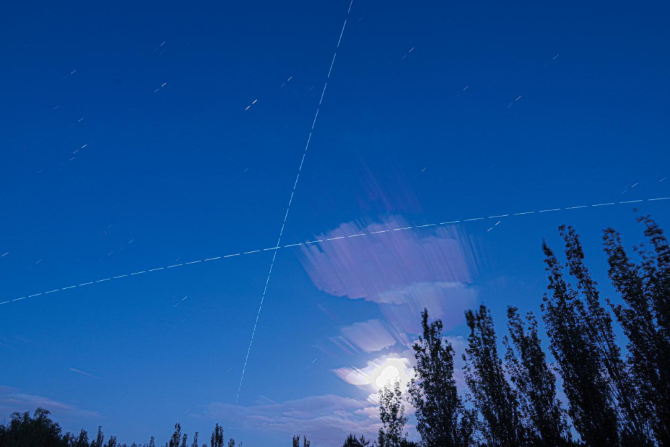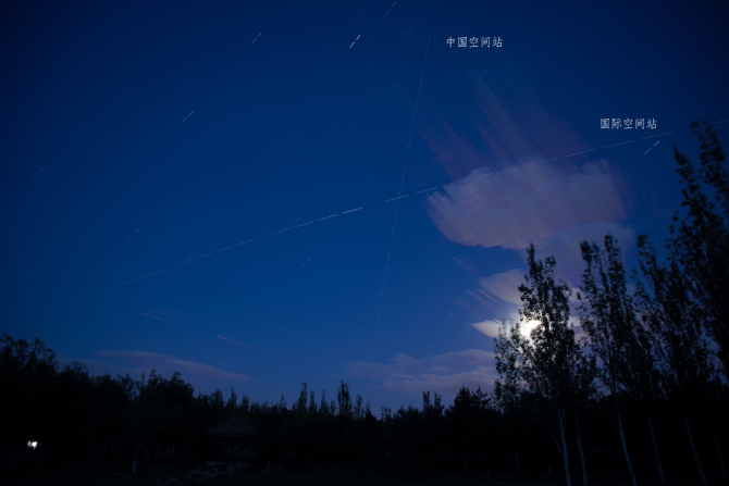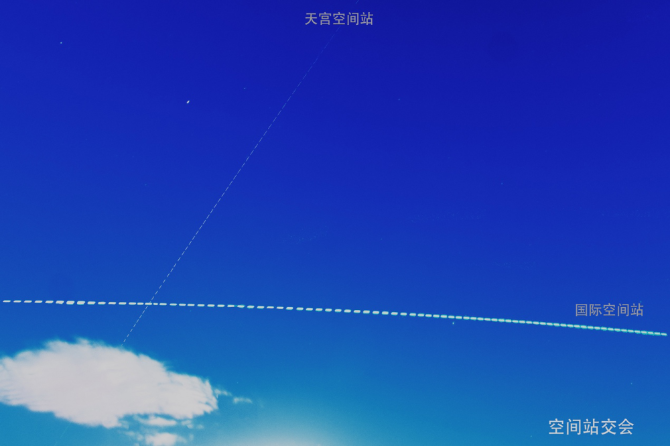 ↑国际空间站、中国空间站相继过境北京(拍摄者:张辰毅 10岁 小学四年级)