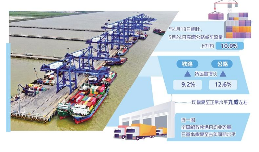 随着网络恢复畅通,全国交通主要运行指标实现稳中向好。数据显示,与4月18日相比,5月24日高速公路货车流量上升约10.9%;铁路、公路货运量分别增长9.2%和12.6%,均恢复至正常水平九成左右。近一周,全国邮政快递日均业务量已基本恢复至去年同期水平。