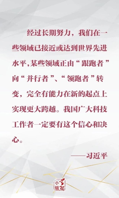 科技立则民族立,科技强则国家强。习近平说:“经过长期努力,我们在一些领域已接近或达到世界先进水平,某些领域正由‘跟跑者’向‘并行者’、‘领跑者’转变,完全有能力在新的起点上实现更大跨越。我国广大科技工作者一定要有这个信心和决心。”