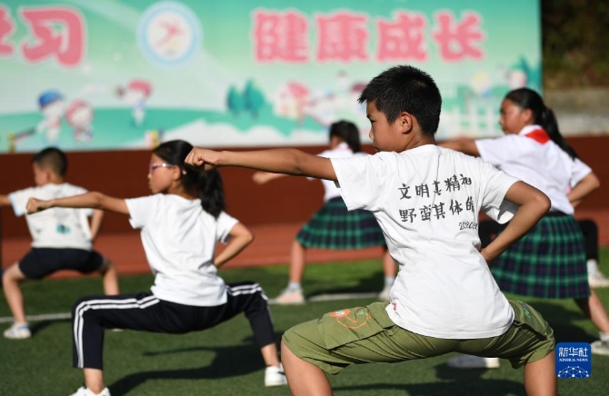 在陕西省安康市平利县老县镇中心小学的操场上,学生们在课后参加武术社团活动(2020年9月7日摄)。新华社记者 李一博 摄