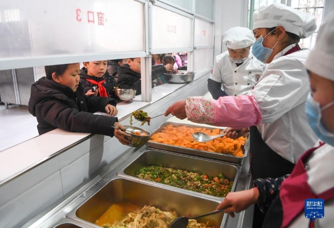 重庆市石柱土家族自治县中益乡小学学生在食堂排队打饭菜(2020年1月10日摄)。新华社记者 王全超 摄