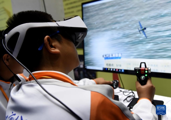 北京市八一学校的学生在北京市中小学生特色科技活动展示上体验VR技术(2018年11月24日摄)。新华社记者 罗晓光 摄