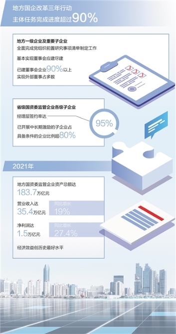 国企改革三年行动实施以来,各地国企改革领导小组推动改革全面发力、多点突破,目前地方国企改革三年行动主体任务完成进度超过90%。2021年,地方国资委监管企业资产总额达到183.7万亿元,营业收入和净利润分别达到35.4万亿元、1.5万亿元,同比分别增长19%、27.4%,经济效益创历史最好水平。