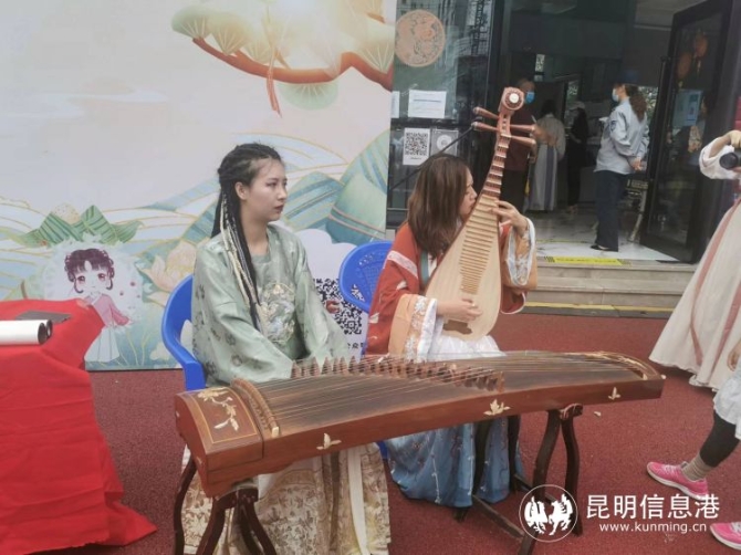 同时,盘龙江游船售票厅外不仅开展包粽子、投壶等端午民俗互动游戏,还有琵琶、古筝等表演,可谓精彩纷呈,吸引了广大市民一同参与。参加活动的肖女士说道,带着孩子来体验汉服游,不仅有趣,还能了解传统文化,非常有意义,很开心。