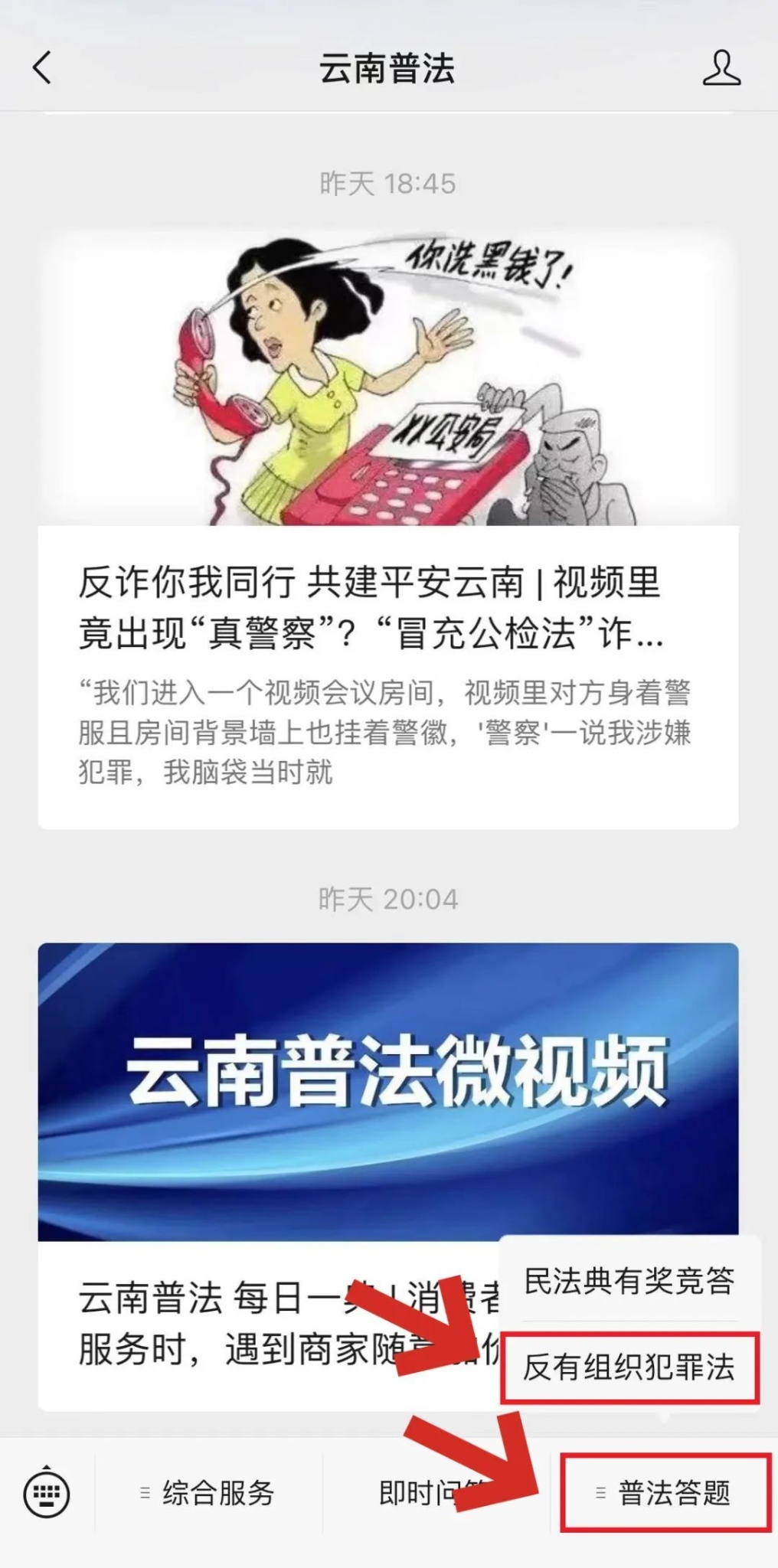 1. 关注“云南普法”微信公众号;