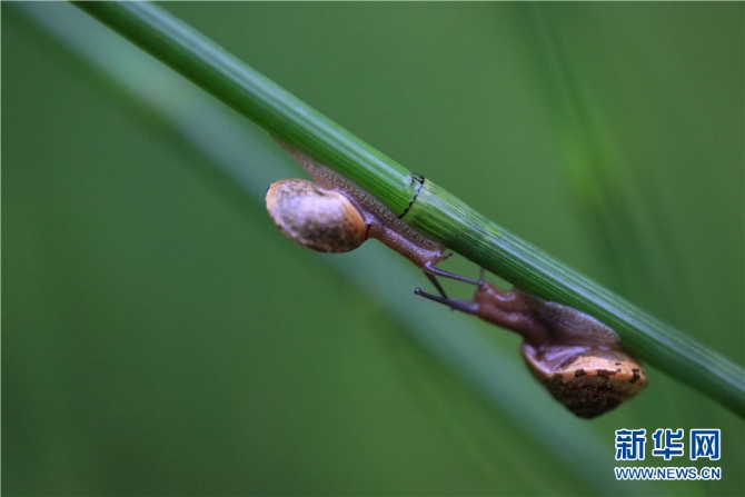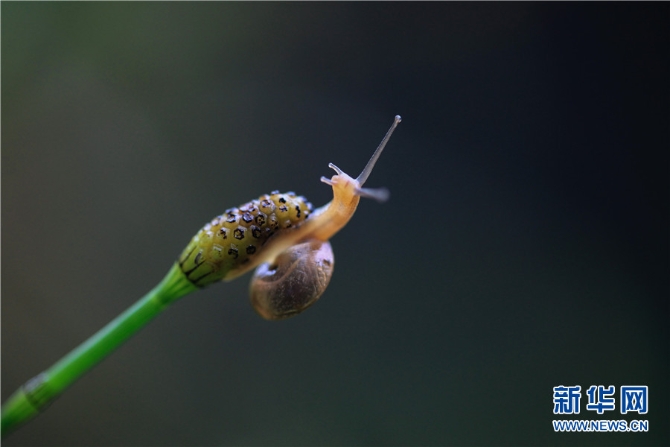 在云南省西双版纳傣族自治州景洪市郊野的节节草花苞上,一只蜗牛仿佛在“引吭高歌”(5月31日摄)。