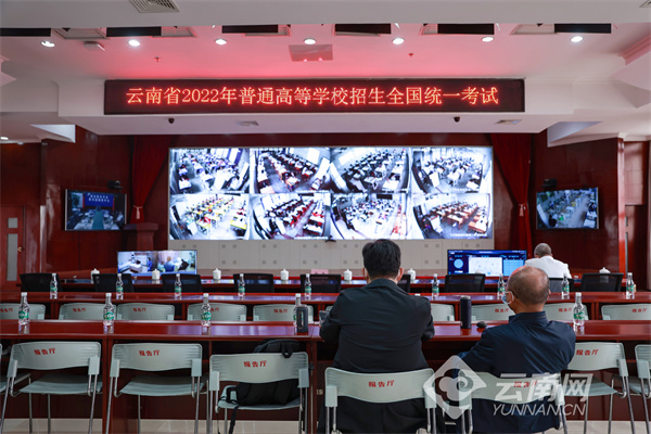 上午9时,省招生考试院2楼的云南省国家教育考试考务指挥中心,大屏幕上清晰地切换着全省各地考场的实时视频画面。大屏幕旁,省考务指挥中心的工作人员通过视频监控,对全省各地的考点、考场不间断进行网上巡查。