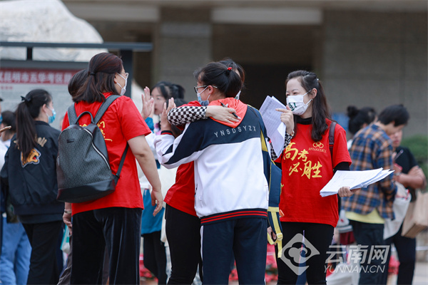 “稳稳地,别慌!”“加油,别紧张!”考点入口一侧,云南师范大学实验中学老师杨存珠和其他几位老师组成了送考队伍,他们统一身穿印有“高考必胜”字样的红色T恤,和入场的孩子们击掌、拥抱,做最后的叮嘱。昆三十中的送考老师给每一个进考场的孩子递上了一颗巧克力,寓意开开心心、甜甜蜜蜜,轻松应考。一旁的云南民族中学老师李加恒一手抱着几束鲜花,一手提着几袋零食。“一些不能来到现场送考的考生家长托我们给孩子买好鲜花和零食,等考试结束给他们一个惊喜。”