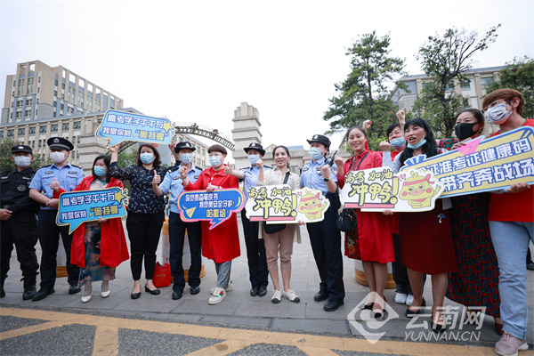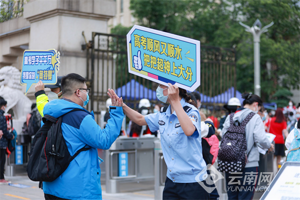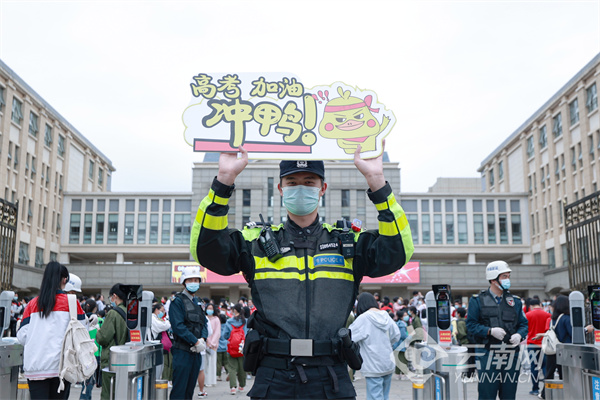 “高考顺风又顺水,把把超神上大分”“高考学子千千万,你是我的‘奥特曼’”……昆一中考点前,昆明市公安局五华分局龙翔派出所的警官们手举一系列“高考加油”的牌子为现场考生加油。龙翔派出所所长甘德武介绍,派出所的90后警官特意找了一些孩子们喜闻乐见的网络热词,制作成加油牌匾,用轻松的方式给考生加油打气。此外,龙翔派出所户籍窗口开通了绿色通道。高考期间窗口7:00准时上班,针对考生遗忘身份证或身份信息无法识别等情况,及时办理好临时身份证,并由专人送到考点,确保考生按时进入考场。