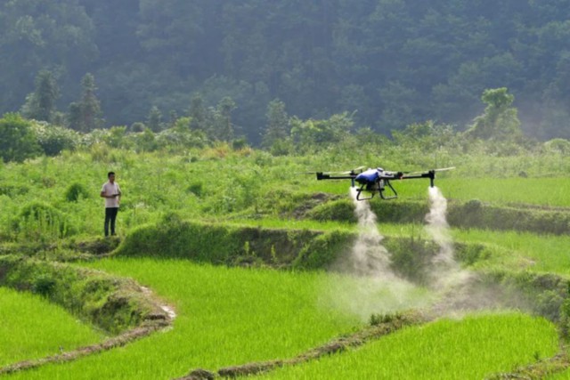 2022年6月6日,湖南省双峰县黄牛峰村,农技员操控植保无人机在田间进行病虫害防治作业 李建新摄/本刊