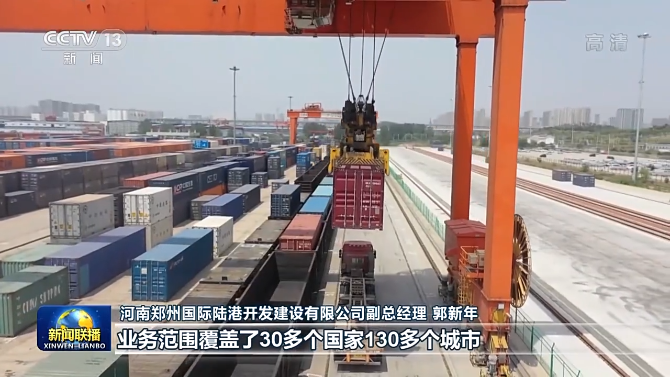 河南郑州国际陆港开发建设有限公司副总经理 郭新年:我们中欧班列中豫号由最初的两个口岸、三条线路,扩展为目前辐射欧洲、中亚、东盟、日韩四个方向的国际物流通道,业务范围覆盖30多个国家130多个城市。