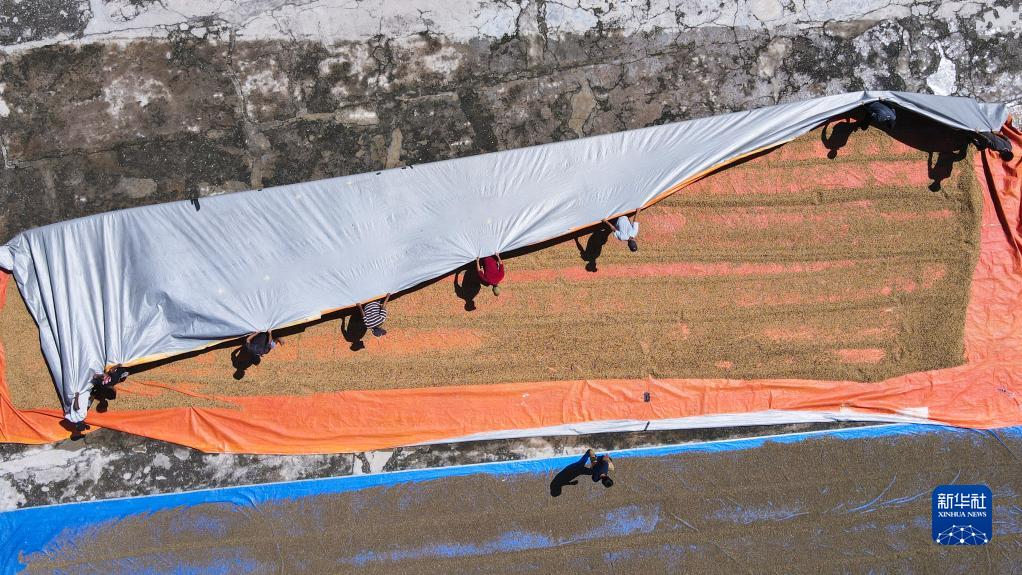 6月6日,工人们在东帝汶埃尔梅拉一家咖啡厂的晒场上劳作(无人机照片)。 新华社记者 徐钦/摄