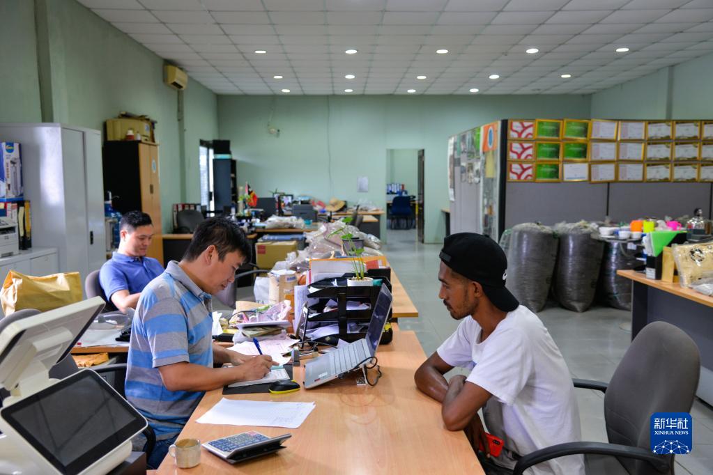 6月6日,在东帝汶埃尔梅拉一家咖啡厂,咖啡厂的财务人员(前左)为咖啡种植户(前右)结账。 新华社记者 徐钦/摄