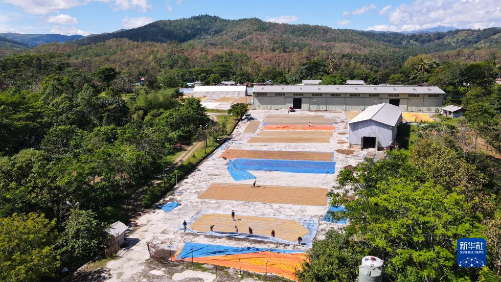 6月6日,在东帝汶埃尔梅拉一家咖啡厂的晒场上,工人们在劳作(无人机照片)。 新华社记者 徐钦/摄